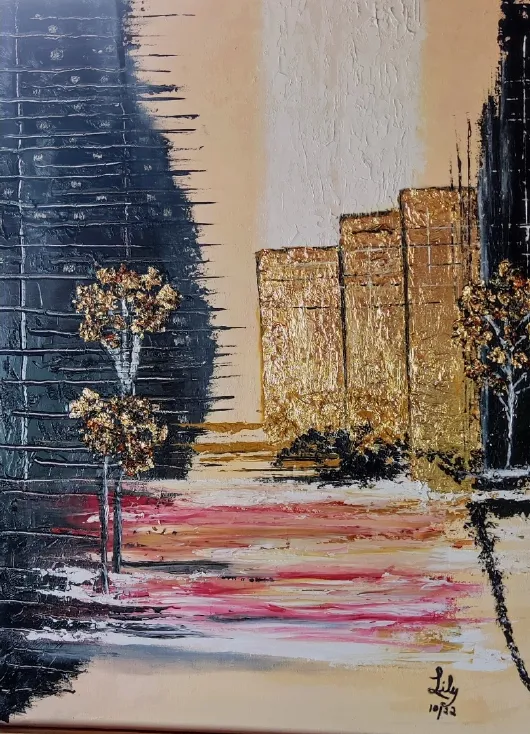 Obra figurativa de un día invernal, captando los colores caprichosos que nos regala la naturaleza en una moderna ciudad en la que sus magníficos edificios también brillan al ponerse el sol.