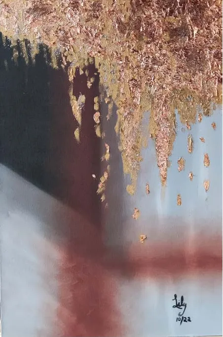 Técnica: (Mixta) Oleo y acrílico con incrustaciones de hojuelas de oro, plata, cobre sobre los árboles.